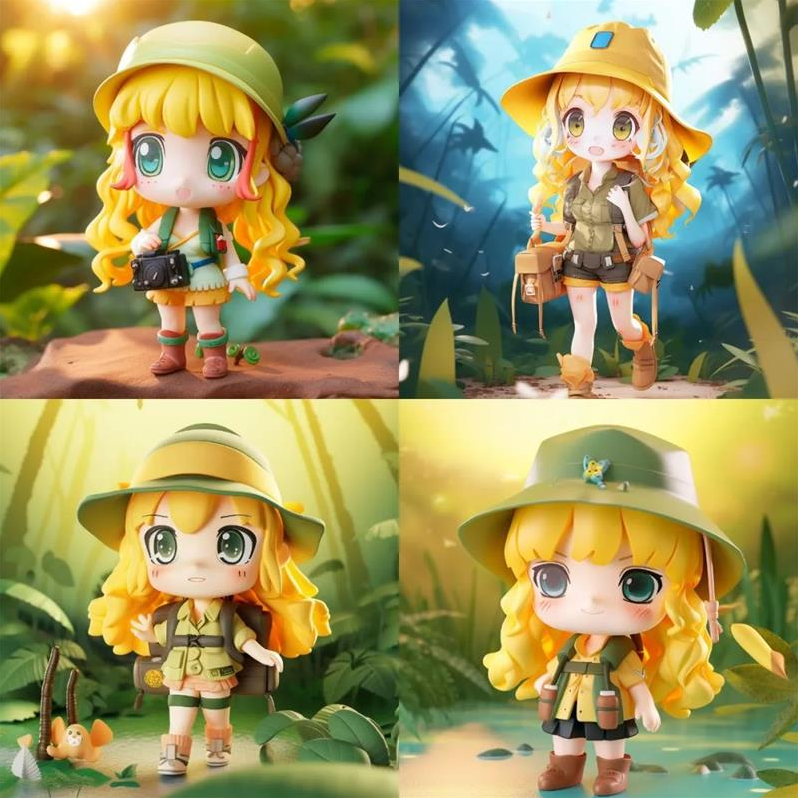 关键词: 彩云译设计 is a wild camping girl, cute wind element elf girl, Yellow wavy hair, blue eyes,cartoonstyling design, backpack holding camera, Wearing cut duck hat, Dense foliage under strong summer sunDense leaves under the strong summer sun, gradient style, tide play blind box, clean backqround, Lauah andsing happily,natural lighting, Bright color,8k, Super Detail, 3D, Depth of Field, Pixar Trend, super realistic, lighttracking, complex details, Art backqround, Super detail, solid color background, fine texture, OC rendererUltra HD, fine texture, front body, 3D rendering, 8k,–ar 3:4 –g 2 –seed 1485209209