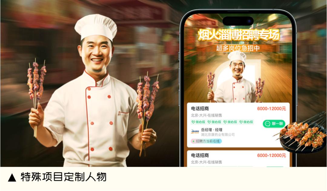 例如赶集直招近期的「烟火淄博招聘专场」需要快速上线,切入“淄博烧烤”热点,设计师通过AI快速产出精准人物素材,同时实现了项目的快速上线,与设计的精准表达。