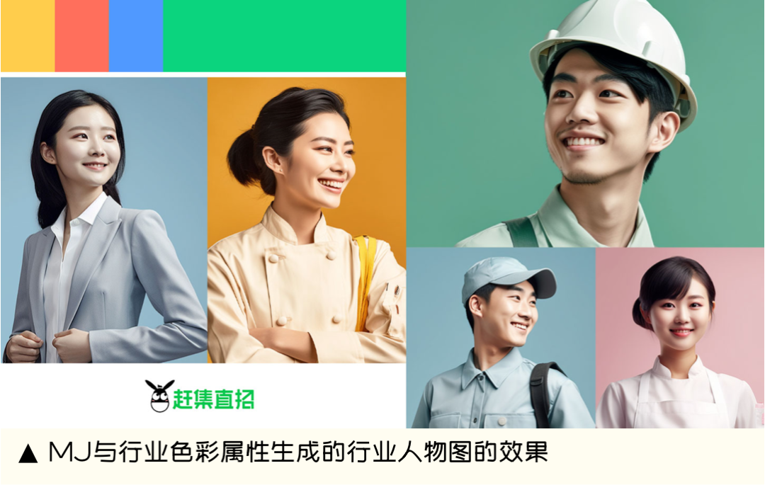 AI人物素材生产方法 使用MidJourney生成人物,可以做到高质量统一的人物形象群体,自由控制体态动作,大幅提升素材质量。我们将AI人物素材生产分为3类:1)基础日常人物素材2)精准行业人物+职业道具素材3)特殊项目定制人物素材1、基础日常人物针对赶集直招的重点行业,使用MJ储备基础的人物素材,通过服装和职业标准色强化角色职业,动作干练自信,表情统一表现出微笑、积极、正能量的态度。这类素材在赶集的日常运营设计中,有较高的复用性。